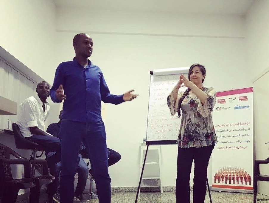 From left to right: Teacher Mobarak Adam, Teacher Hassan Abdullahi, Dr. Shireen Keyl giving a class held at partner organisation HelpAge in 2019